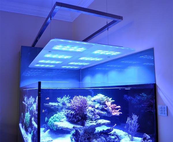AI SOL LED's over an aquarium \Aquarium owners: Dana & Karla\Tank Spec: Approximately 1000L\Tank dims: 1682 x 1018 x 600 high 19mm Low Iron glass, external overflow\Running:\Deltec 3070s skimmer\Abyss 200: return\D&D Salt\Lights: 8 x SOL blue, running on controller\Cabinet: clad in coloured glass\Water Change 10% weekly with D&D through automated water change system\Aquarium built by Vincent at AQUARIUM CONNECTIONS\