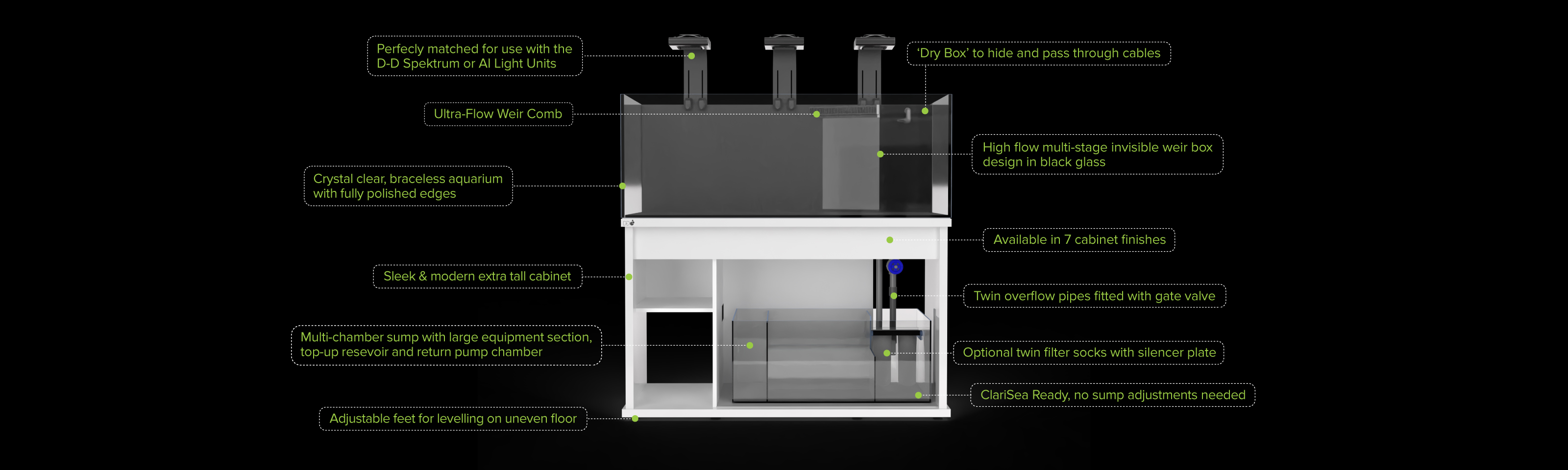 This tool takes you through the build process from start to finish, first selecting the specific aquarium range, the tank size and colour finish, before allowing you to add from a huge range of equipment options to create your perfect aquarium. To help visualise what the different cabinet finishes will look like when the aquarium is running, there is even an option to add fish and corals to the marine aquariums or plants and décor to the freshwater and Aquascaper models.