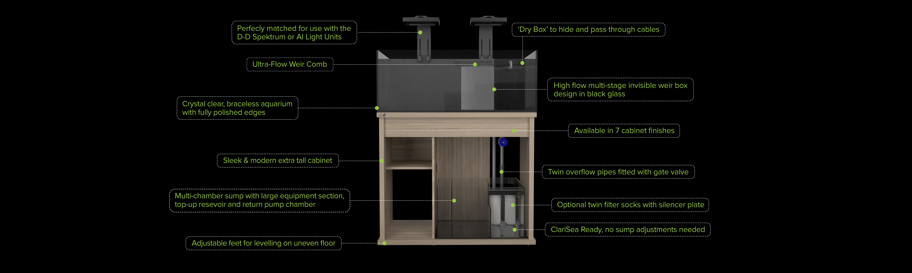 This tool takes you through the build process from start to finish, first selecting the specific aquarium range, the tank size and colour finish, before allowing you to add from a huge range of equipment options to create your perfect aquarium. To help visualise what the different cabinet finishes will look like when the aquarium is running, there is even an option to add fish and corals to the marine aquariums or plants and décor to the freshwater and Aquascaper models.