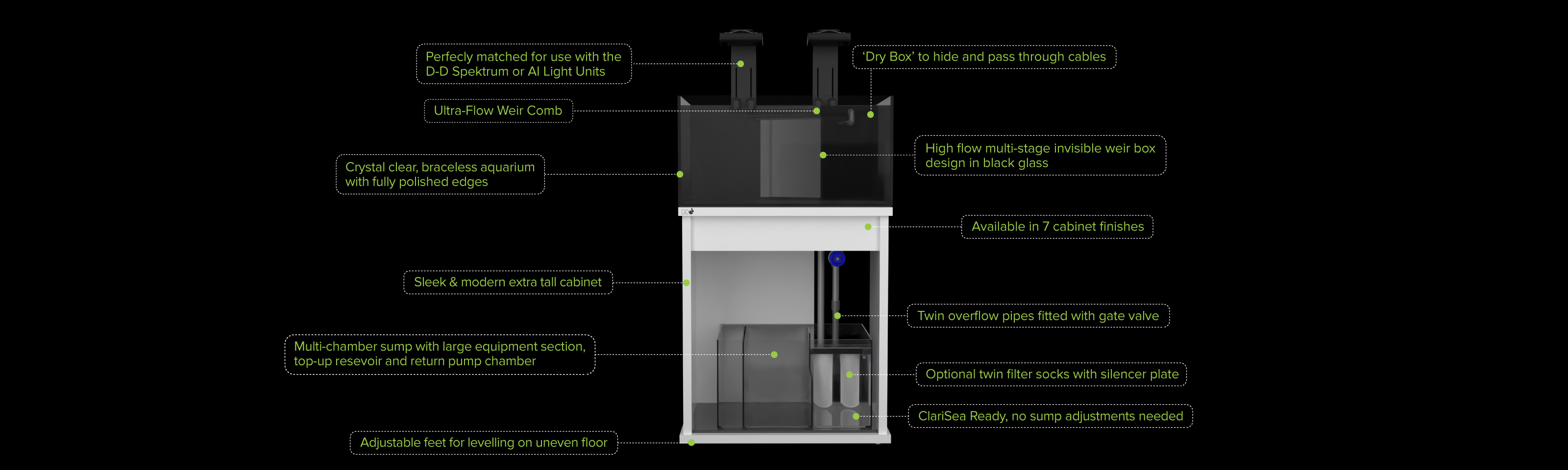 This tool takes you through the build process from start to finish, first selecting the specific aquarium range, the tank size and colour finish, before allowing you to add from a huge range of equipment options to create your perfect aquarium. To help visualise what the different cabinet finishes will look like when the aquarium is running, there is even an option to add fish and corals to the marine aquariums or plants and décor to the freshwater and Aquascaper models.