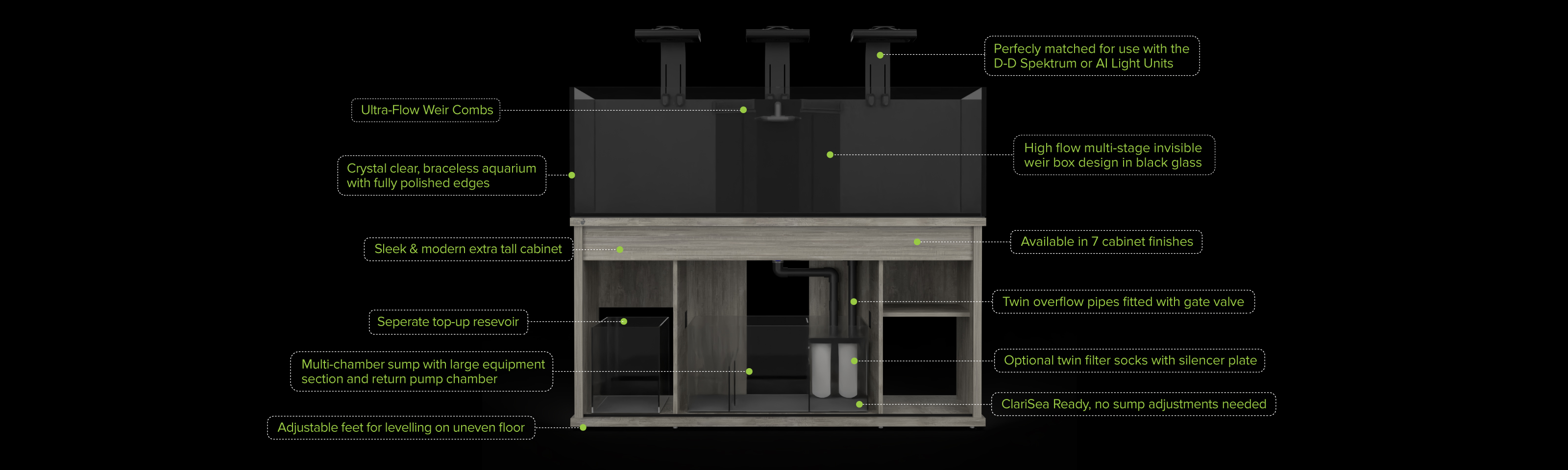 This tool takes you through the build process from start to finish, first selecting the specific aquarium range, the tank size and colour finish, before allowing you to add from a huge range of equipment options to create your perfect aquarium. To help visualise what the different cabinet finishes will look like when the aquarium is running, there is even an option to add fish and corals to the marine aquariums or plants and décor to the freshwater and Aquascaper models.