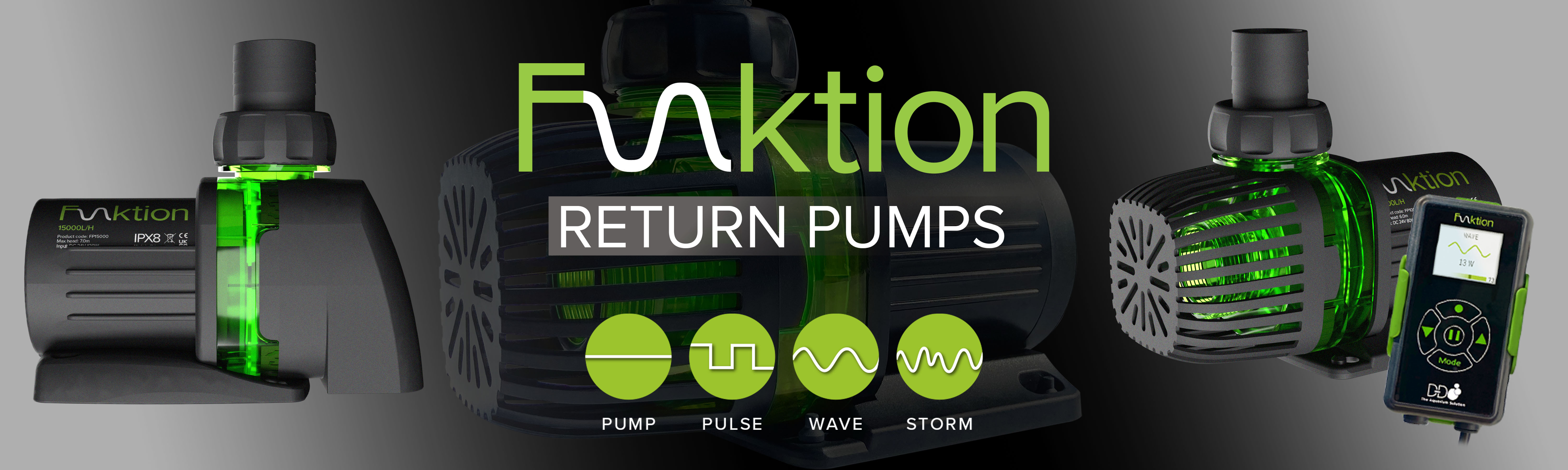 The D-D Funktion pumps are a multi-function DC pump with a unique digital controller, featuring three wave modes and a constant running setting. These pumps are suitable as a return pump, for running media reactors or as a closed loop pump (5000/6500/10000/15000/20000 models only).